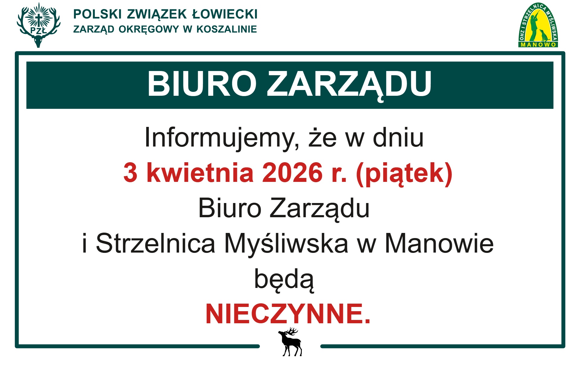 Informujemy, że w dniu 03.04.2026 r. (piątek) – Biuro Zarządu Okręgowego PZŁ w Koszalinie oraz Strzelnica Myśliwska w Manowie będą NIECZYNNE.